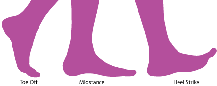 The heel hits the ground first (heel strike), followed by the forefoot, stabilizing the foot and supporting the weight of the body over the supporting limb (midstance). At this point in the gait cycle, the foot turns inward to adapt to the ground. As the leg moves forward with the foot remaining on the ground, the heel follows by lifting upward (toe off). All these actions require the orchestrated movement of many different muscles of the leg, and imbalances (including those of the knee and hip) can result in increased stress, discomfort and potential injury.