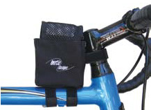 My 47 cm top tube doesn’t leave much room for a Triathlon type snack bag. But Inertia designs makes a Tri-Box in a size small which is only 3.5″ x 1.5″ x 3.5″ and weighs 1.25 oz. It’s lined with 14 oz truck tarp for extra stability and easy cleaning. It closes with a mesh flap and velcro closure. With this smaller adjusted size, and its added stability, I can come off the saddle and not have my thighs rubbing against the sides of larger, wobbly bag.